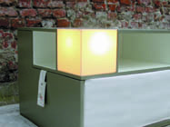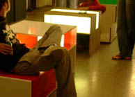 NINA EGGEMANN & DOMINIQUE RUSAKE Möbel mit Multipler Persönlichkeit. Auf den ersten blick präsentieren sie sich als zwei harmlose Tische, die den Raum durch integrierte Leuchten in ein atmosphärisches Licht hüllen. Doch bei Bedarf entfalten sie sich zu einer gemütlichen Sitzgelegenheit oder einem kuscheligen Gästebett. ZURÜCK